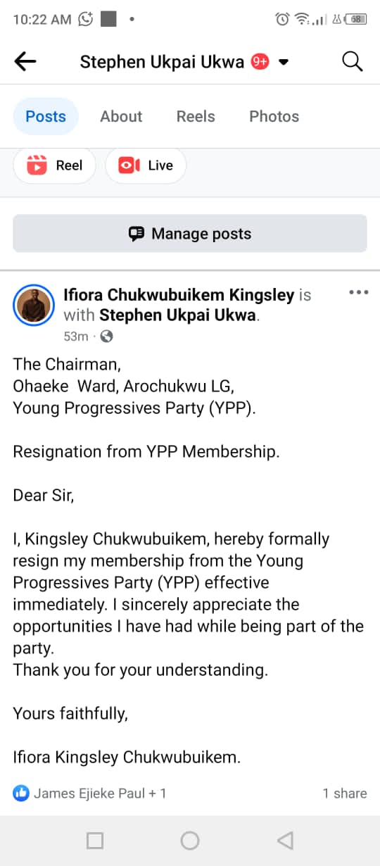 Ifiora Chukwubuikem Kingsley equally wrote to the Chairman of Ohaeke Ward, Arochukwu LG, tendering his resignation from the Young Progressives Party effective immediately.