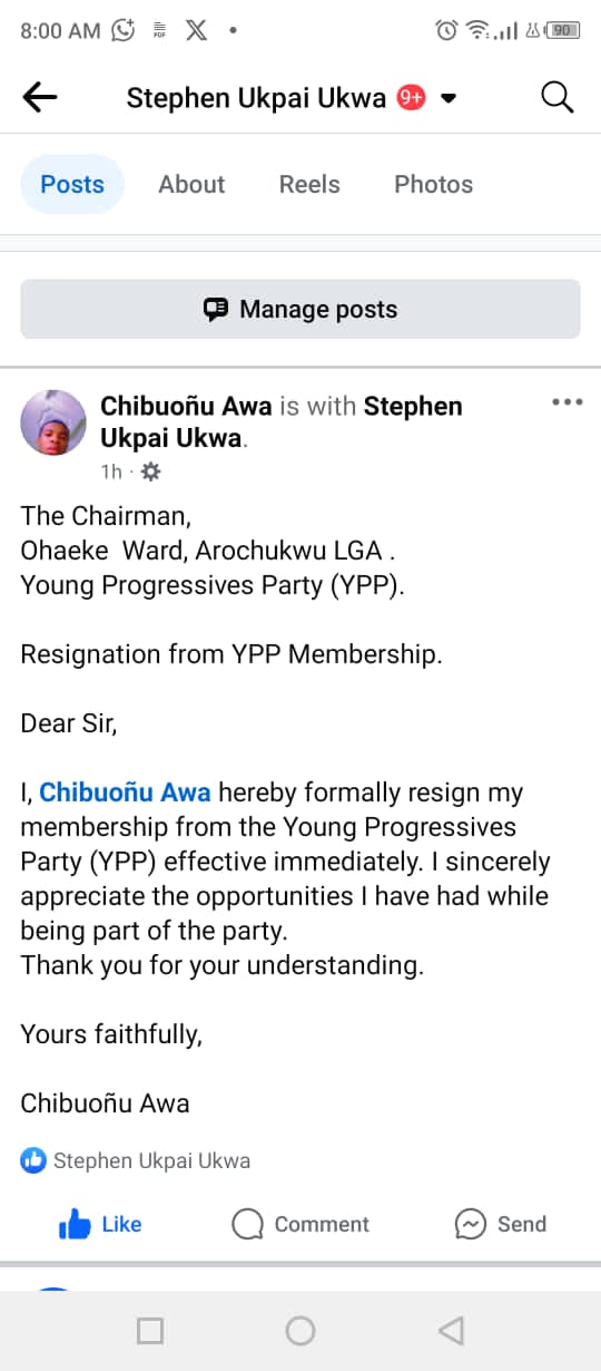 Chibuoñu Awa addressed his resignation letter to the Chairman of Ohaeke Ward, Arochukwu LGA, formally withdrawing his YPP membership with immediate effect.