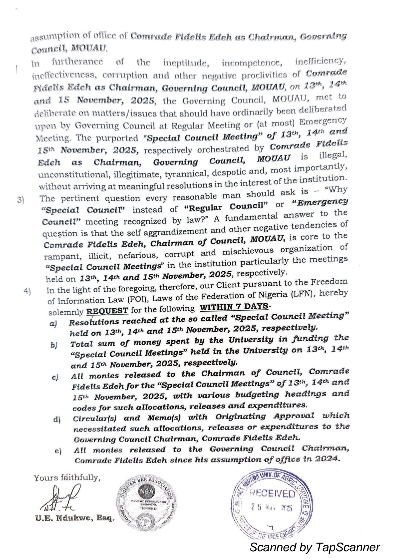 ” The purported ” Special Council Meeting ” of 13th, 14th and 15th November 2025,respectively orchestrated by Comrade Fidelis Edeh as Chairman , Governing Council, MOUAU is illegal, unconstitutional, illegitimate, tyrannical, despotic and most importantly and wasteful without arriving at any meaningful resolution in the interest of the institution ‘, they submitted.