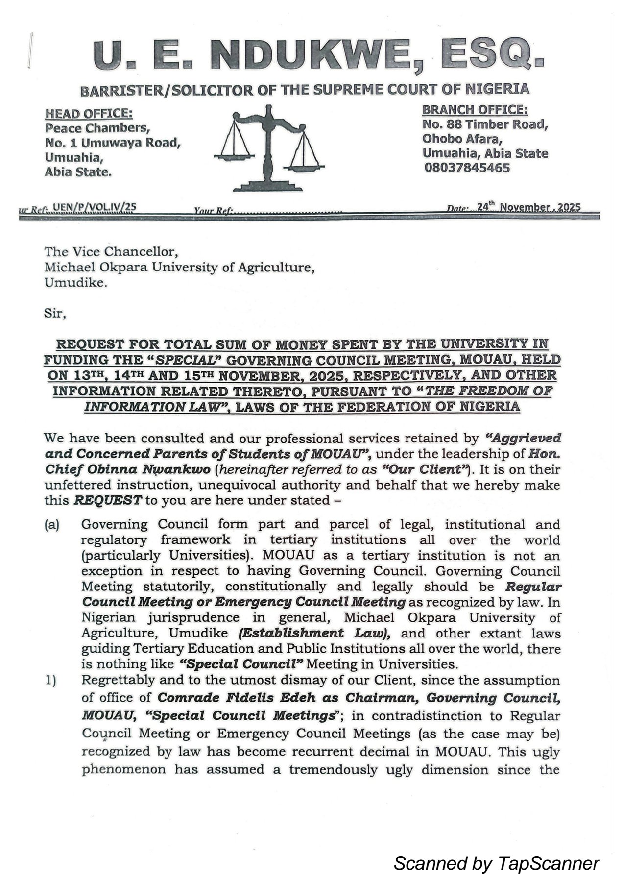 ” The purported ” Special Council Meeting ” of 13th, 14th and 15th November 2025,respectively orchestrated by Comrade Fidelis Edeh as Chairman , Governing Council, MOUAU is illegal, unconstitutional, illegitimate, tyrannical, despotic and most importantly and wasteful without arriving at any meaningful resolution in the interest of the institution ‘, they submitted.